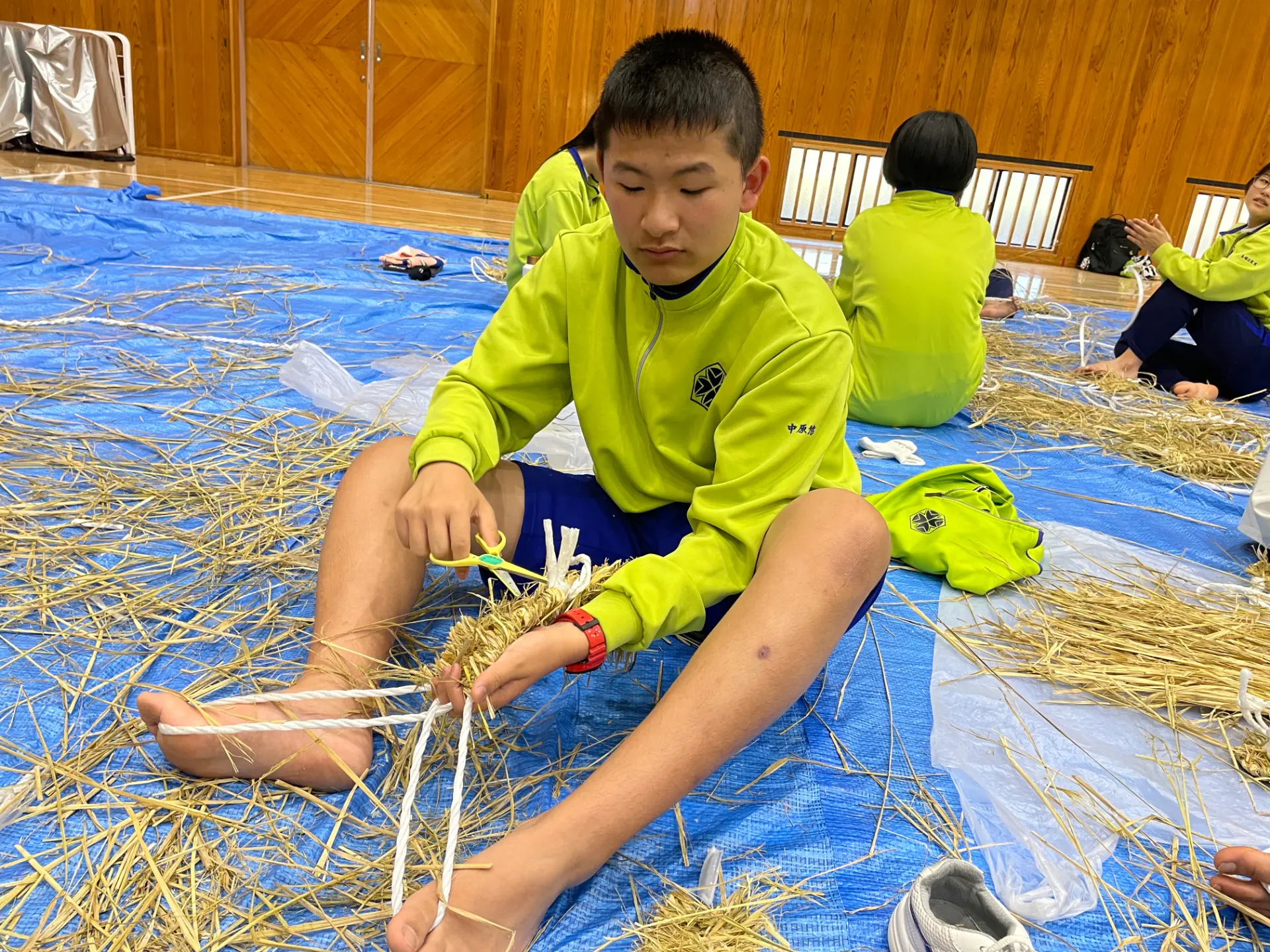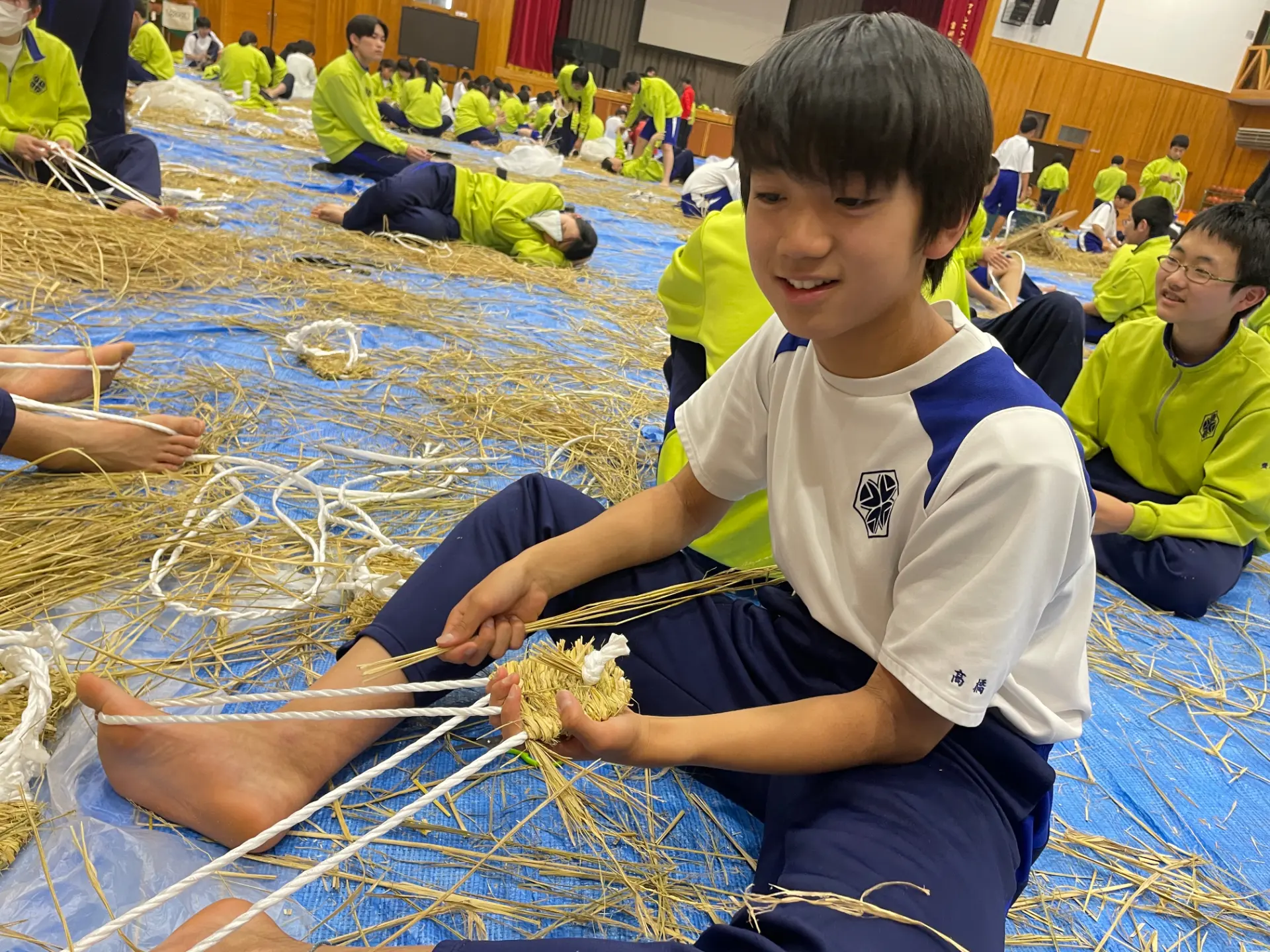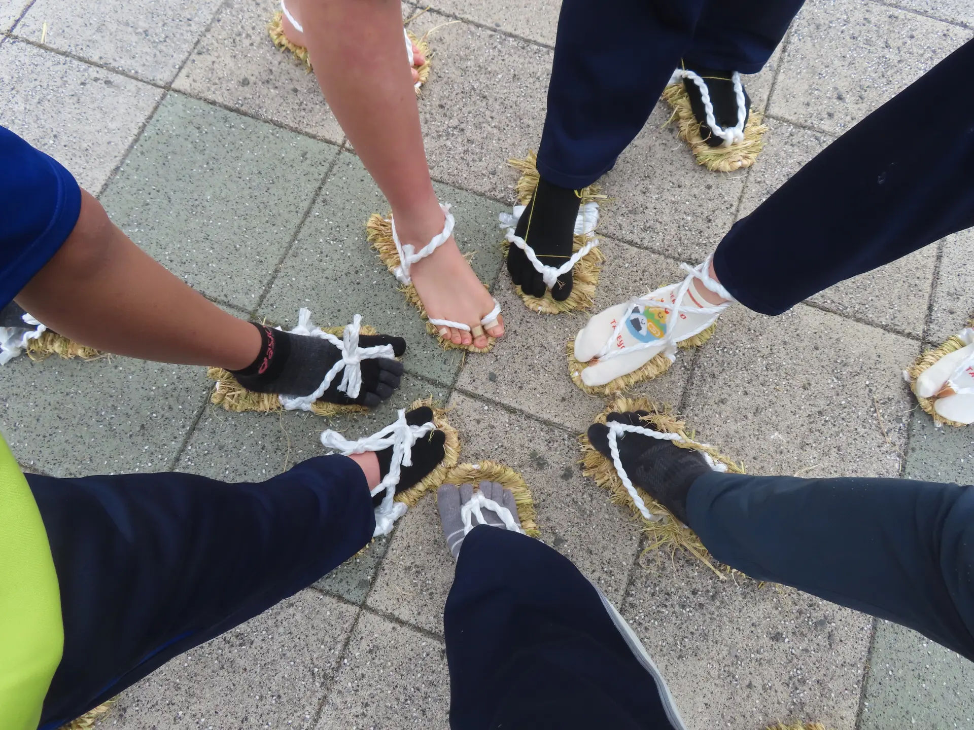本校では、全校生徒が毎年わらじを作っています。5・6年生が代々受け継がれてきたわらじの作り方を下級生に教えながら、わらじ遠足で履く自分のわらじを一足作りあげます。職員も一緒になって自分のわらじを作ります。
