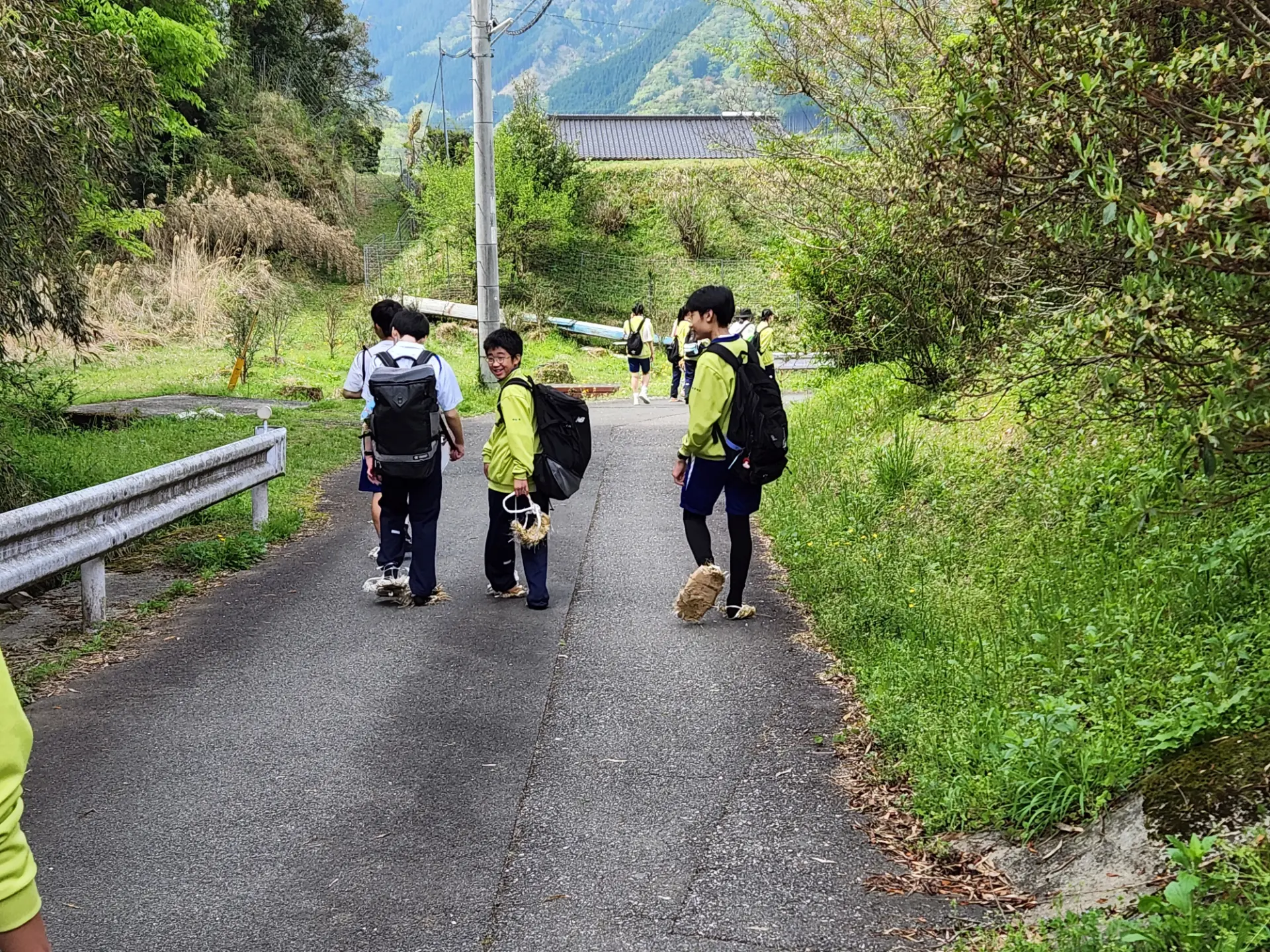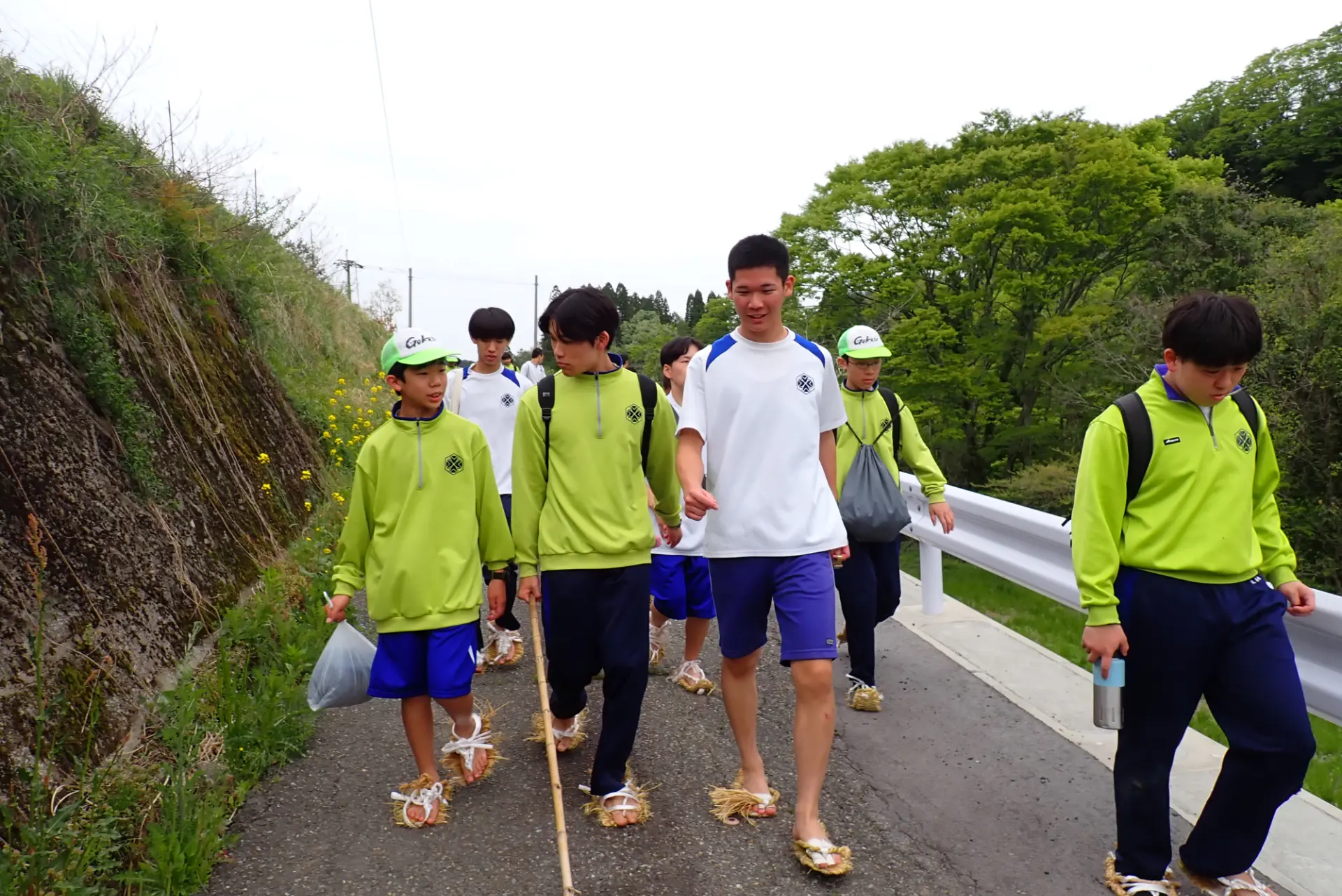 「わらじ遠足」は開校当時から行われている恒例の行事です。第1回グローバルフォレストピア学習において自分で作った。わらじを履いて、五ヶ瀬町内を散策します。ファミリー単位で歩きながら、棚田や用水路、茶畑など五ヶ瀬の魅力を感じながら、感性を磨きます。また、生徒会が企画する様々な行事で交流を深め、新入生を歓迎する意味もあります。