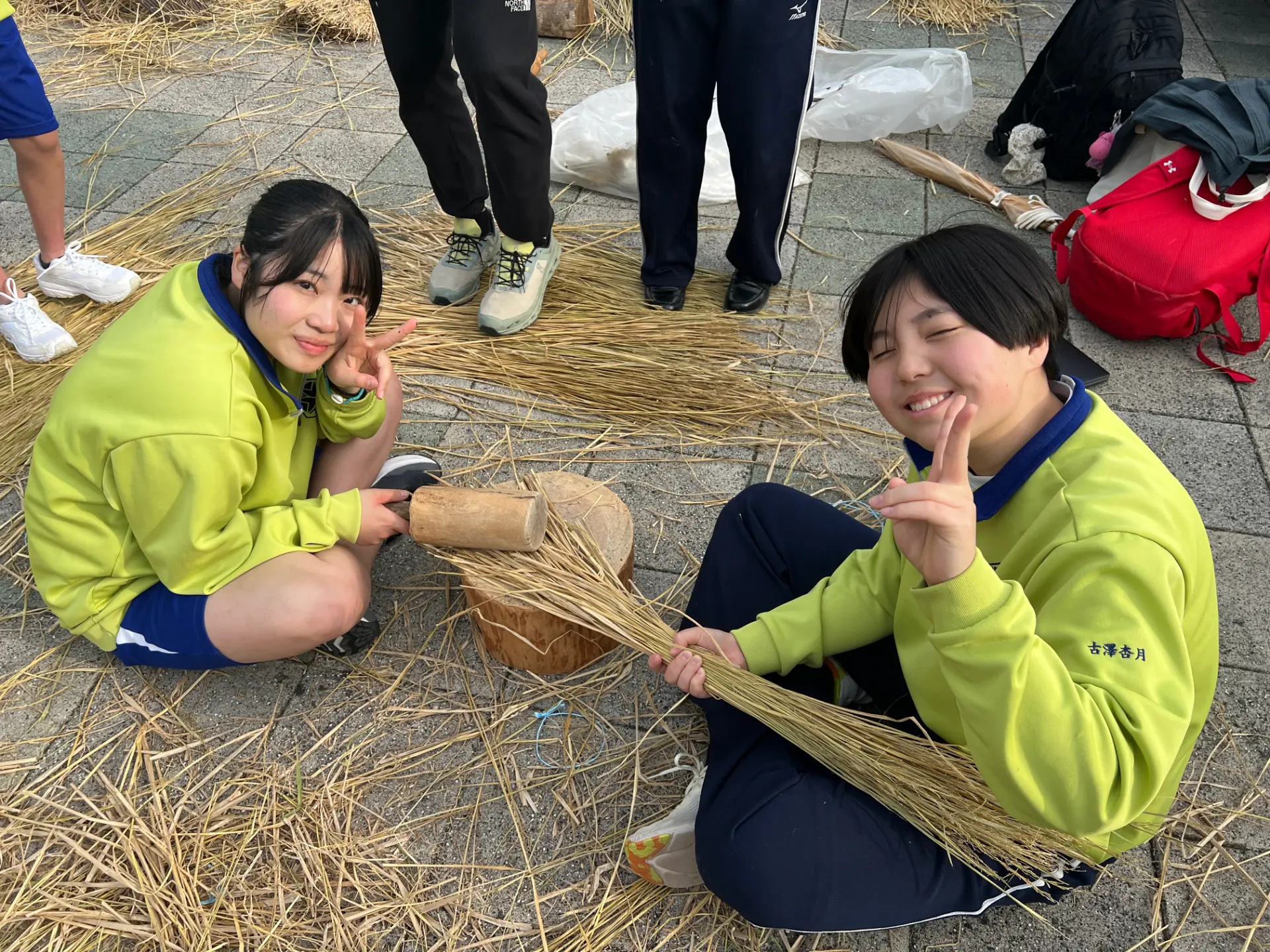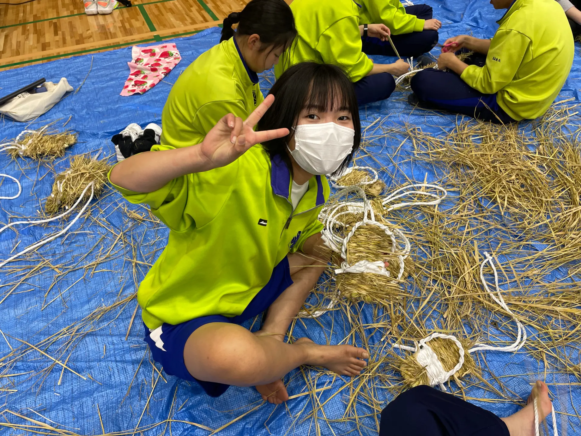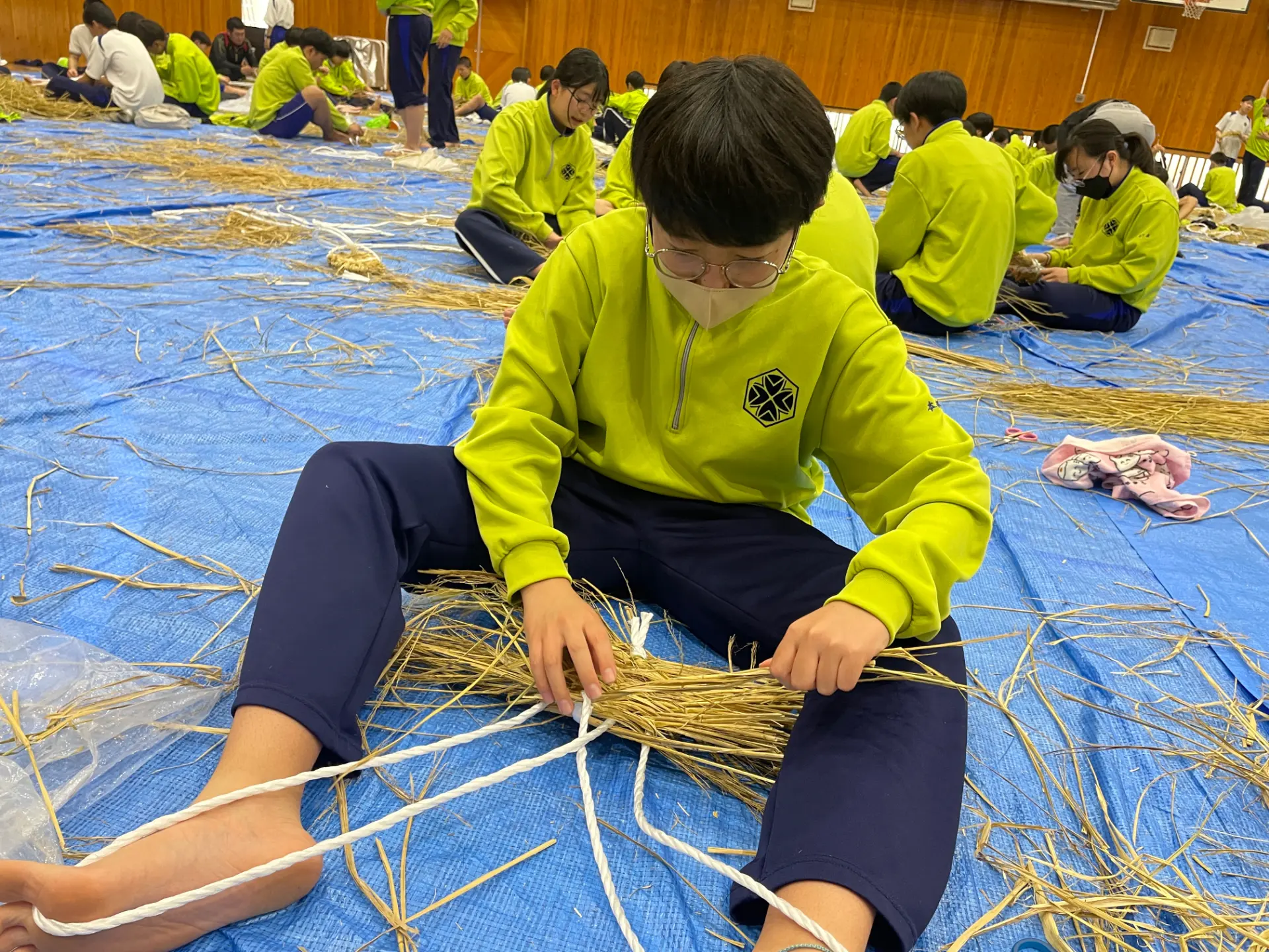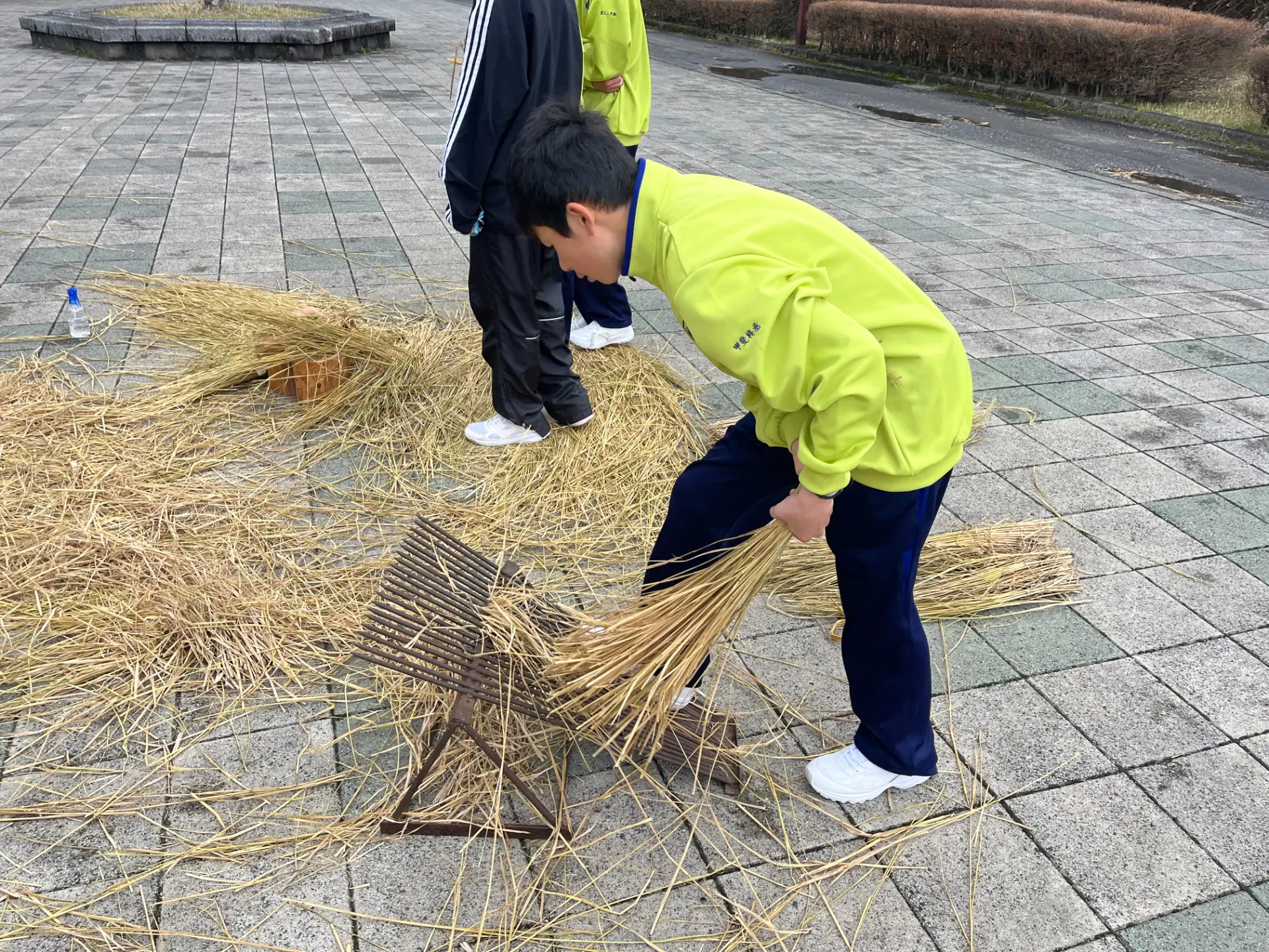 わらじをつくりやすくするように、放課後を利用してわらをうったり、すいたりします。